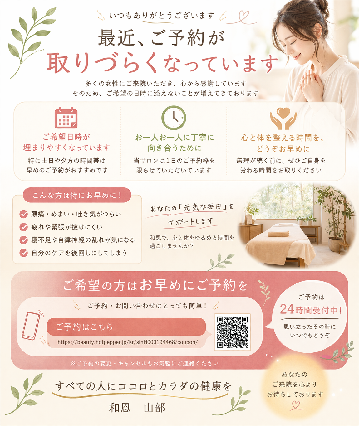 頭痛、めまい、吐き気 が強くなりご来院される女性が増えています